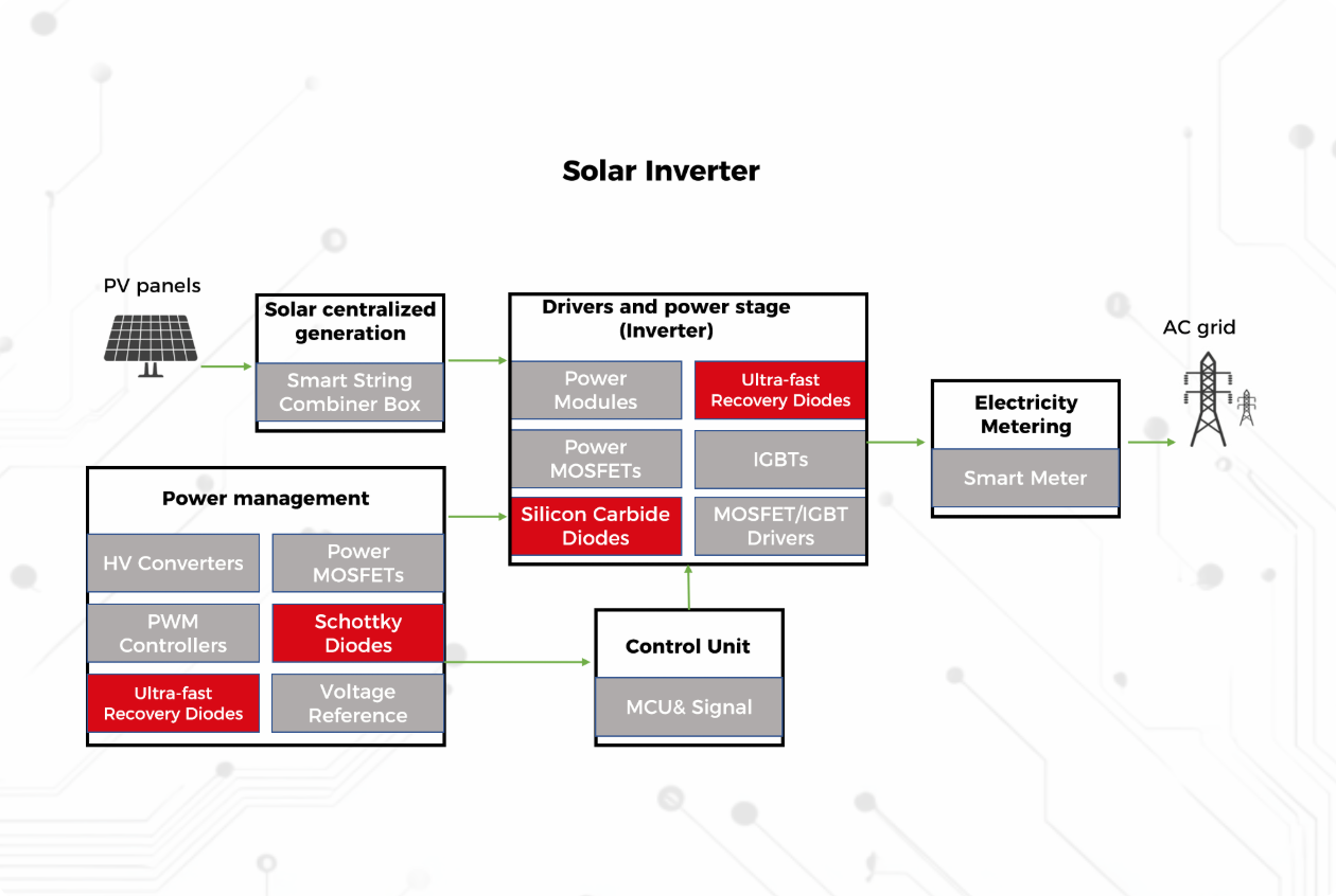 Solar inverter mainly includes drivers and power stage, control unit and power management unit. The drivers and power stage also includes a DC-DC conversion stage to adapt to the voltage level and realize the maximum power point tracking (MPPT) function to maximize the transmission of energy from the panel, and a DC-AC conversion stage to correctly shape the current and voltage waveforms transmitted to the AC grid. The solar inverter has anti islanding function to ensure the safety of AC disconnection.